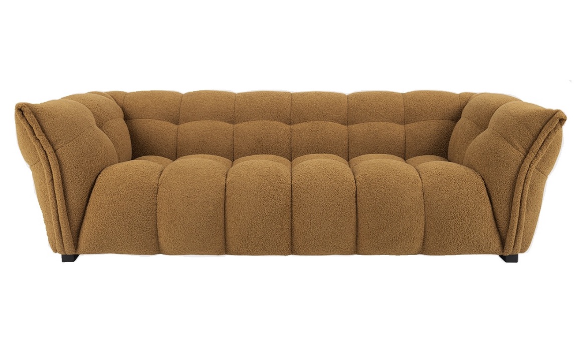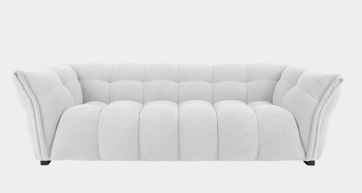 Ihastuttava ja pehmoinen bukleetyyppinen verhoilukangas tekee sohvasta kutsuvan pesän. Nauti ja oleile ♥