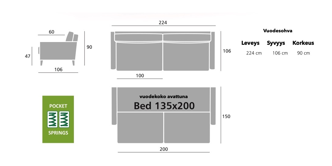 Vuodesohva vailla vertaansa! Helppokäyttöinen mekanismi on käden käänteessä avattu vuoteeksi. Helene vuodesohva on muotoilultaan yksinkertaisen kaunis ja selkeä. Istuttavuudeltaan hyvä&ryhdikäs. Istuimien laadukkaat pussijouset lisäävät istuinmukavuutta ja tekevät tästä vuodesohvasta samanaikaisesti tukevan&rennon. Selkätyynyihin taas on valittu puolijämäkkä mutta joustava silikonikuitutäyte, mikä täydentää sopivasti mukavaa istuintuntumaa. 17 cm korkeat jalat tuovat ilmavuutta sohvaan ja myös sohvan alta imurointi käy vaivatta. Sohvan saa muutettua vuoteeksi kätevästi ja nopeasti vetämällä istuinosaa eteenpäin –> vuode aukeaa –> selkänojan saa kaadettua alas ja peti on valmis käytettäväksi. Vuodekoko on avattuna tilava; 135×200 cm ja pedissä majoitat mukavasti joko satunnaiset yövieraat tai vastaavasti voit käyttää vuodetta myös päivittäisessä käytössä. Istuintyynyt kiinteät, selkätyynyt irralliset.