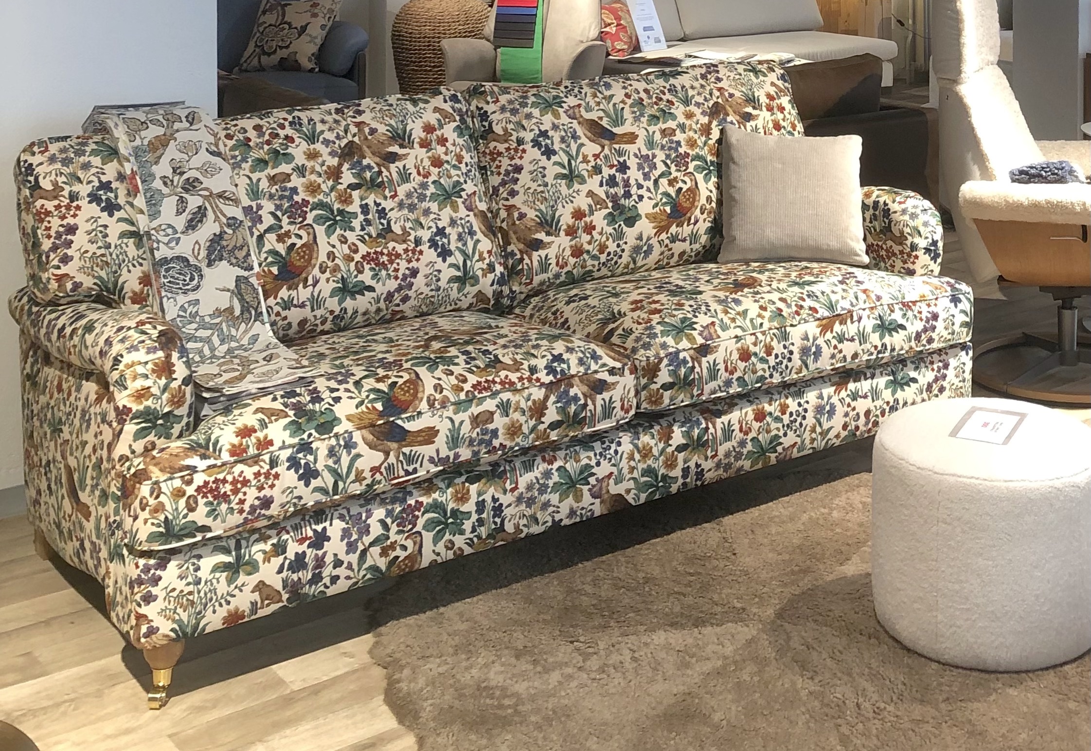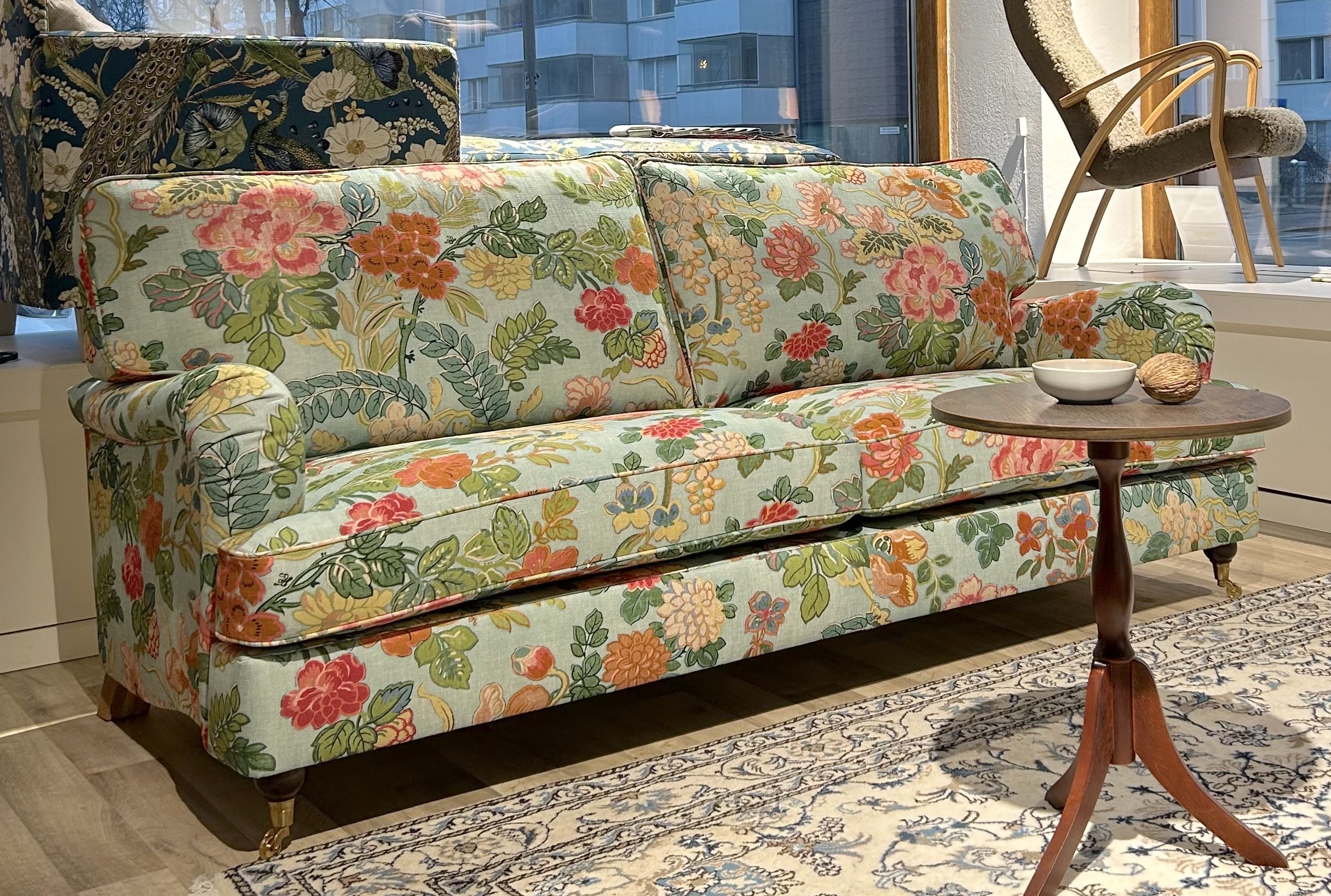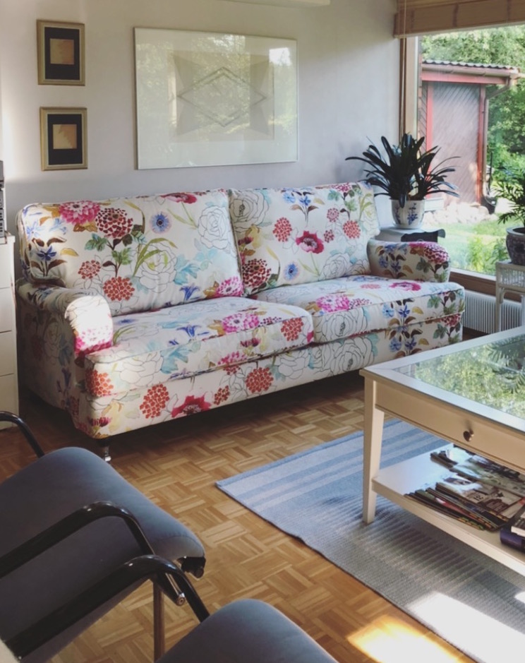 Sohvan verhoilun voi valita sadoista malleista: perinteinen yksivärinen, sametti, ruutu, raita, kukka…. Vain mielikuvitus on rajana ♥ Myymälässä esillä vaaleansin/vaaleanpun/vihreä kukallinen malli, kuvanro 1 ja 2. Tervetuloa paikanpäälle ihastumaan, niin valitaan juuri sinulle sopivin verhoilu ja kokonaisuus.