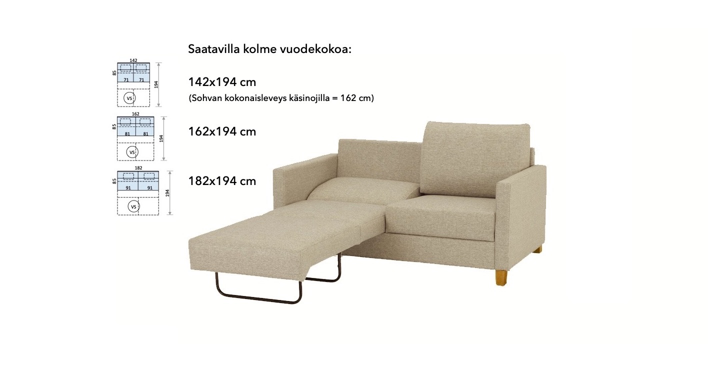 Lena vuodesohvasta saat käden käänteessä näppärästi vuoteen tai kaksi! Erinomaisena lisänä ominaisuus jossa sohvasta saadaan tilattua kolmea erilaista vuodekokoa, minkä ansiosta käytettävyys myös pienissä tiloissa on huomioitu hyvin. Vuodekoot: 142×194 cm | 162×194 cm | 182×194 cm